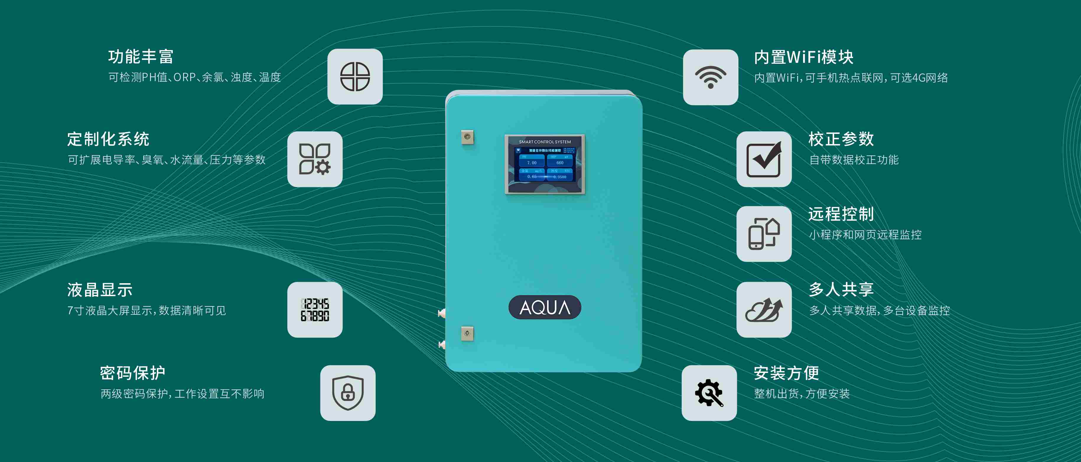 AQUA宅男在线播放宅男天堂污污视频設備旗下水質監控儀(AUT-3000)采用西門子PLC模塊,進口箱體,施耐德電子元器件;界麵簡潔明了,中英文可選。