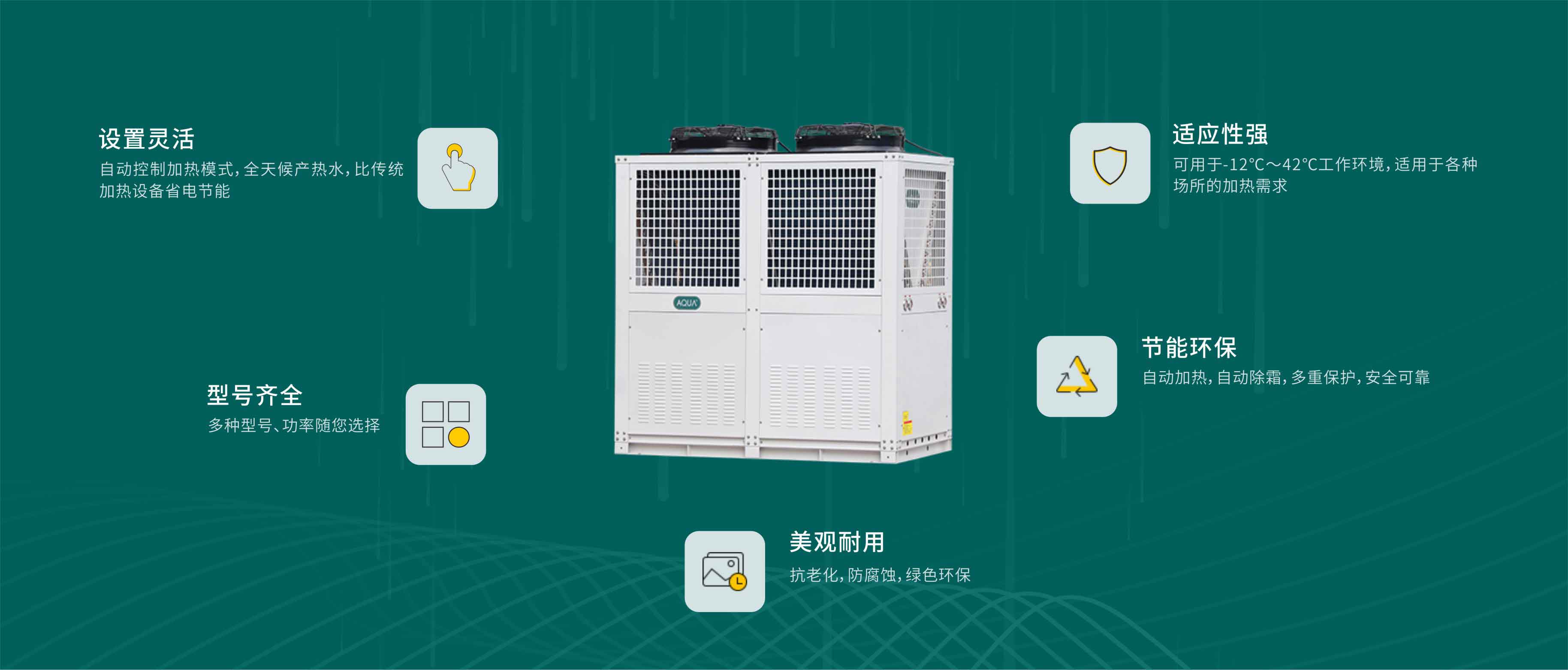 外觀優雅、大氣,抗老化、耐腐蝕。全天候可靠工作。空氣源熱泵是一種從低溫熱源吸取熱量,使其在較高溫度下轉換為可利用能源的高效率的環保節能型產品。AQUA宅男在线播放空氣源恒溫熱泵分為常溫和低溫兩種不同型號。